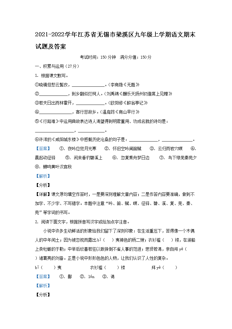 【文档预览】 文档大全网整理发布2021-2022学年江苏省无锡市梁溪区九年级上学期语文期末试题及答案(Word版),前五页预览如下:
