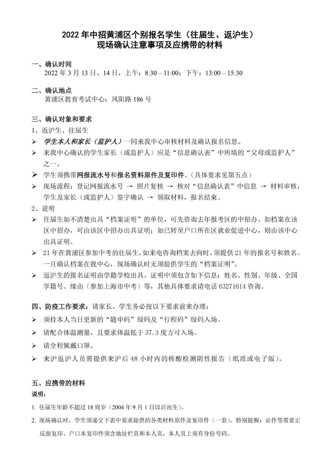 2022上海黄浦区中招个别报名学生(往届生、返沪生)现场确认注意事项及应携带的材料03-20