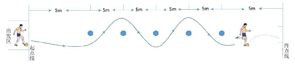 设置要求如下:长度40米以上平整场地。测试距离30米,起点至第一杆距为5米,各杆间距5米,共设5根标志杆(杆高1.2米以上)。起点线中间1米处为出发区域。