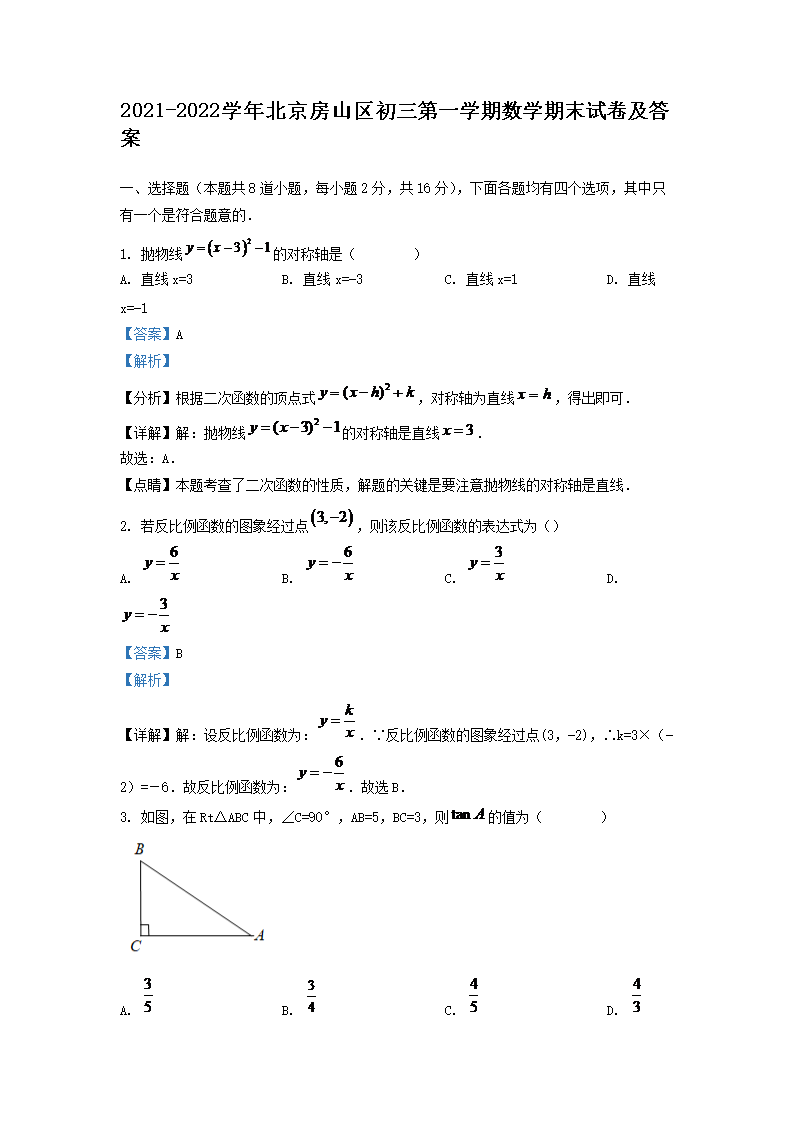 2021-2022学年北京房山区初三第一学期数学期末试卷及答案(Word版)07-04