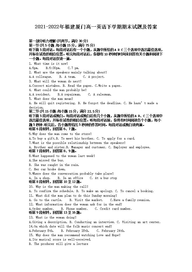 【文档预览】 文档大全网整理发布2021-2022年福建厦门高一英语下学期期末试题及答案(Word版),前五页预览如下: