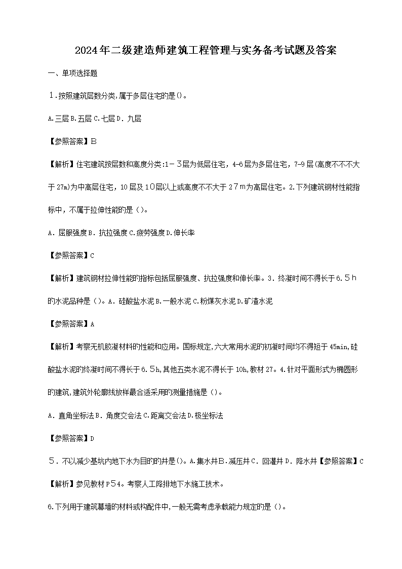 【文档预览】 文档大全网整理发布2024年二级建造师建筑工程管理与实务备考试题及答案(Word版),前五页预览如下: