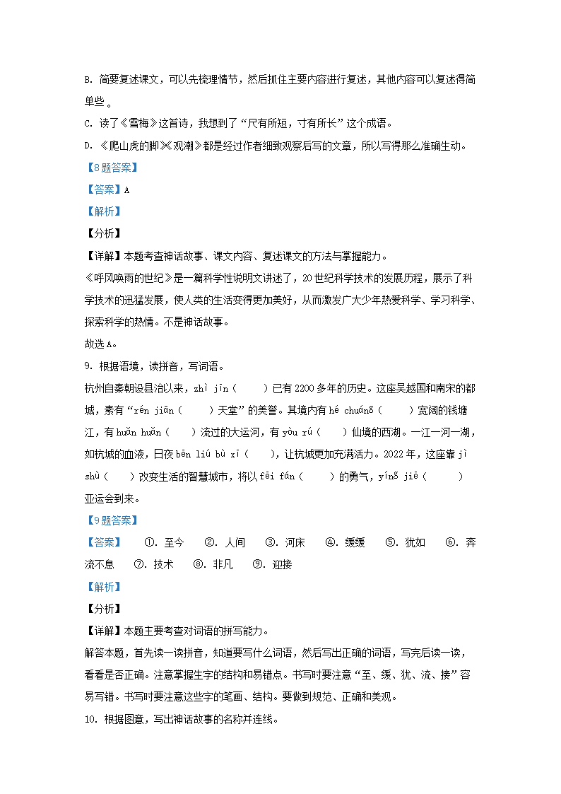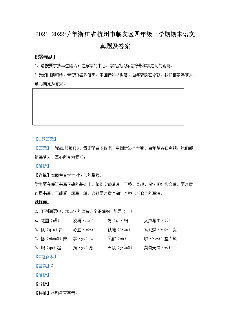 2021-2022学年浙江省杭州市临安区四年级上学期期末语文真题及答案(Word版)09-29