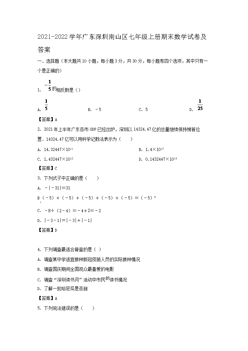 【文档预览】 文档大全网整理发布2021-2022学年广东深圳南山区七年级上册期末数学试卷及答案(Word版),前五页预览如下: