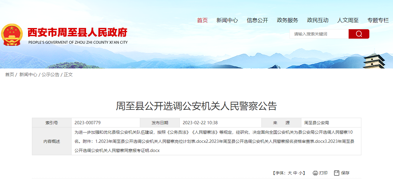 【#招警考试# 导语】©文档大全网从周至县人民政府了解到,2023年陕西西安市周至县选调公安机关人民警察10人,相关事宜如下: