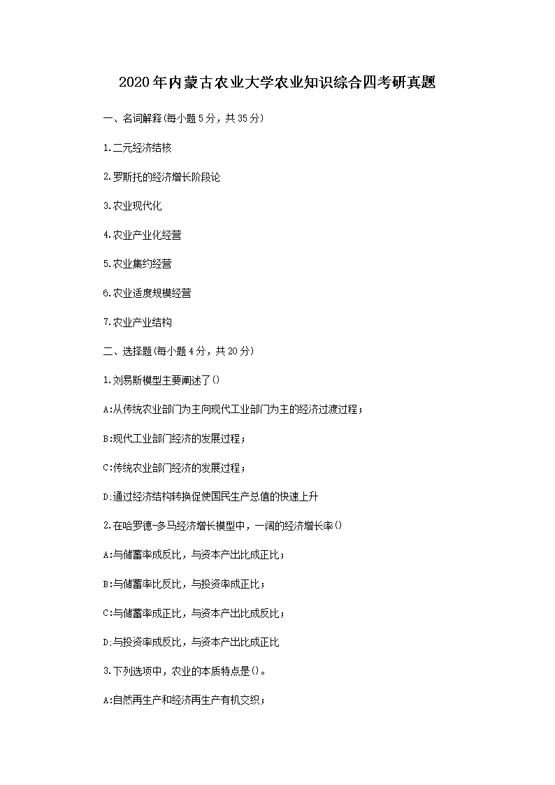 2020年内蒙古农业大学农业知识综合四考研真题(Word版)07-07