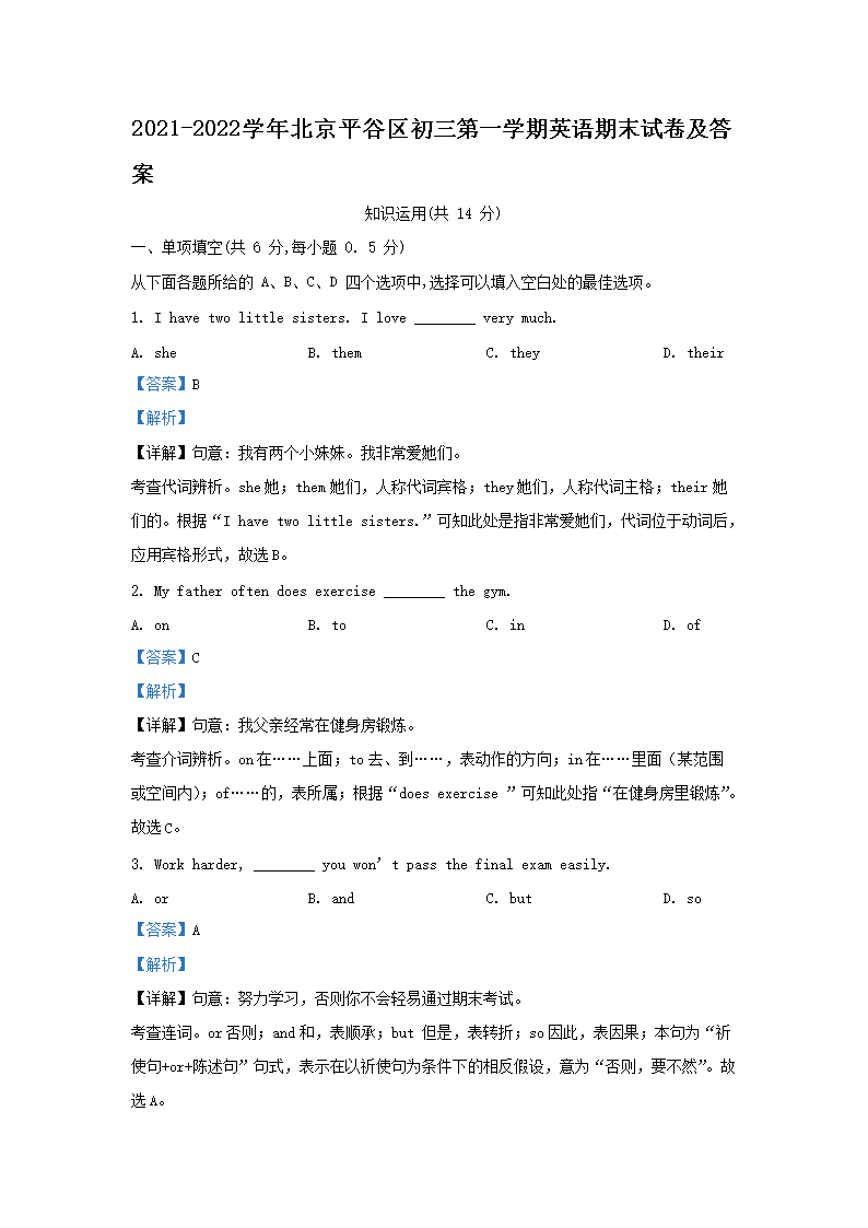 【文档预览】 文档大全网整理发布2021-2022学年北京平谷区初三第一学期英语期末试卷及答案(Word版),前五页预览如下: