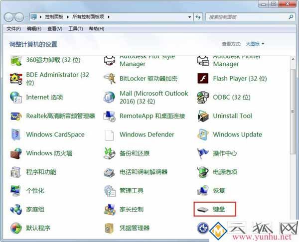 1、打开控制面板,找到键盘;