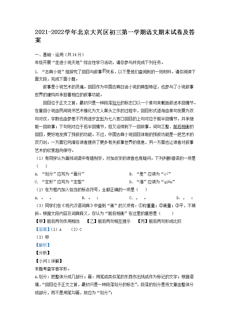 【文档预览】 文档大全网整理发布2021-2022学年北京大兴区初三第一学期语文期末试卷及答案(Word版),前五页预览如下: