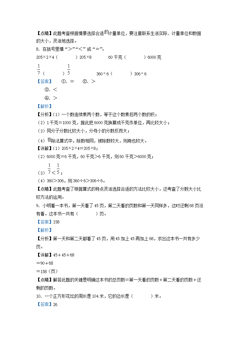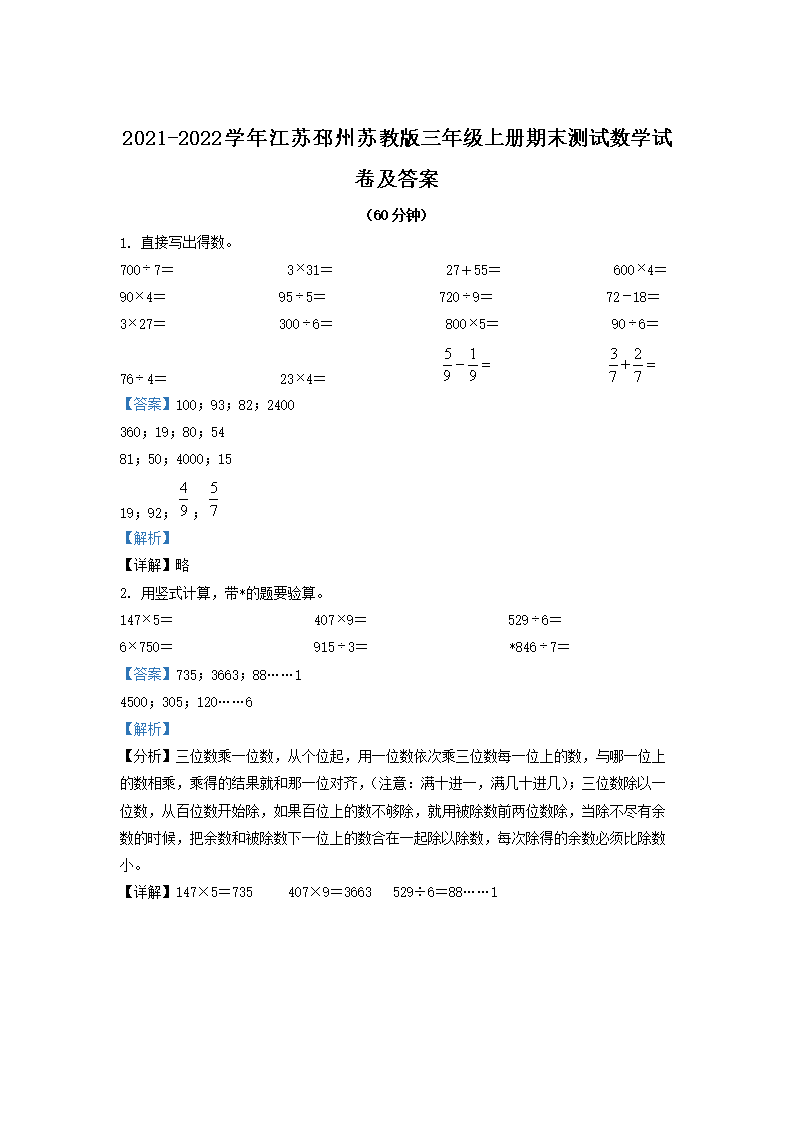 2021-2022学年江苏邳州苏教版三年级上册期末测试数学试卷及答案(Word版)07-18