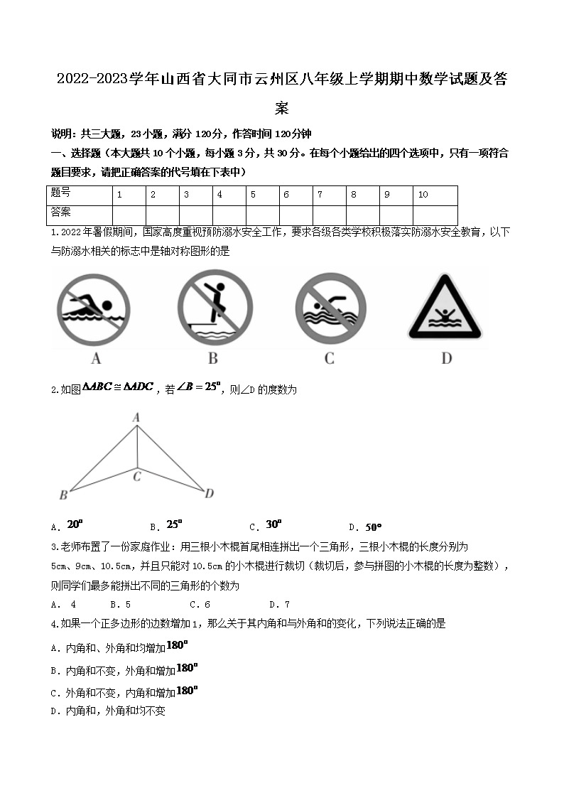 2022-2023学年山西省大同市云州区八年级上学期期中数学试题及答案(Word版)10-13