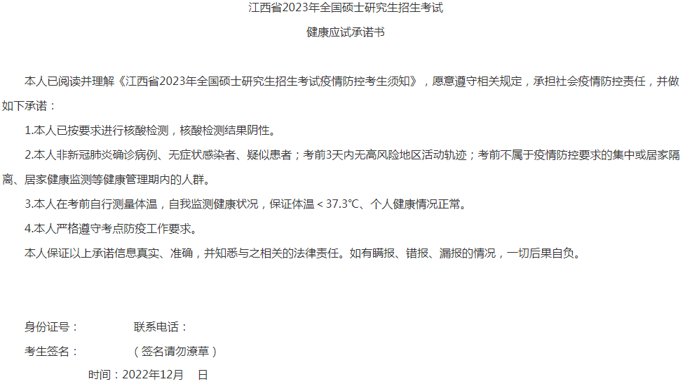 3.考生须登录“2023年江西省硕士研究生招生考试考生健康状况登记系统”(http://jdyw.jxeea.cn:82/),按要求于12月22日前完成健康信息填报,并将12月22日前核酸检测结果上传。同时,核酸异常考生请及时与市教育考试中心联系。联系方式:0796-8239870,0796-8239928。