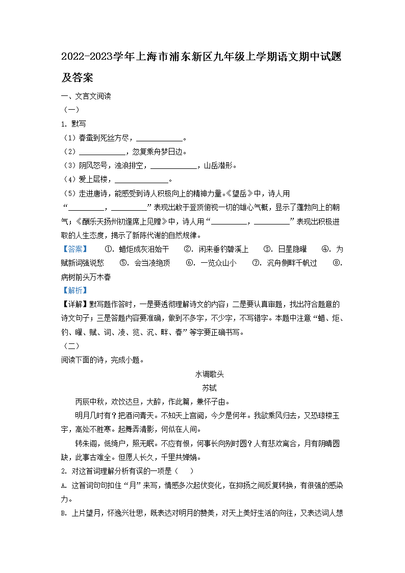 2022-2023学年上海市浦东新区九年级上学期语文期中试题及答案(Word版)10-18