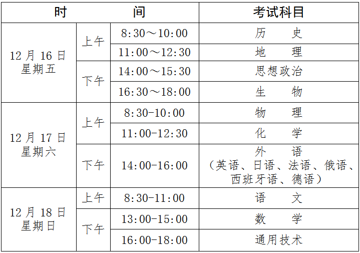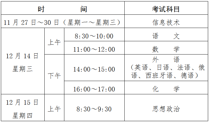 2.12月学业水平合格性科目为语文、数学、外语、化学、思想政治5个科目,时间为12月14日—15日。