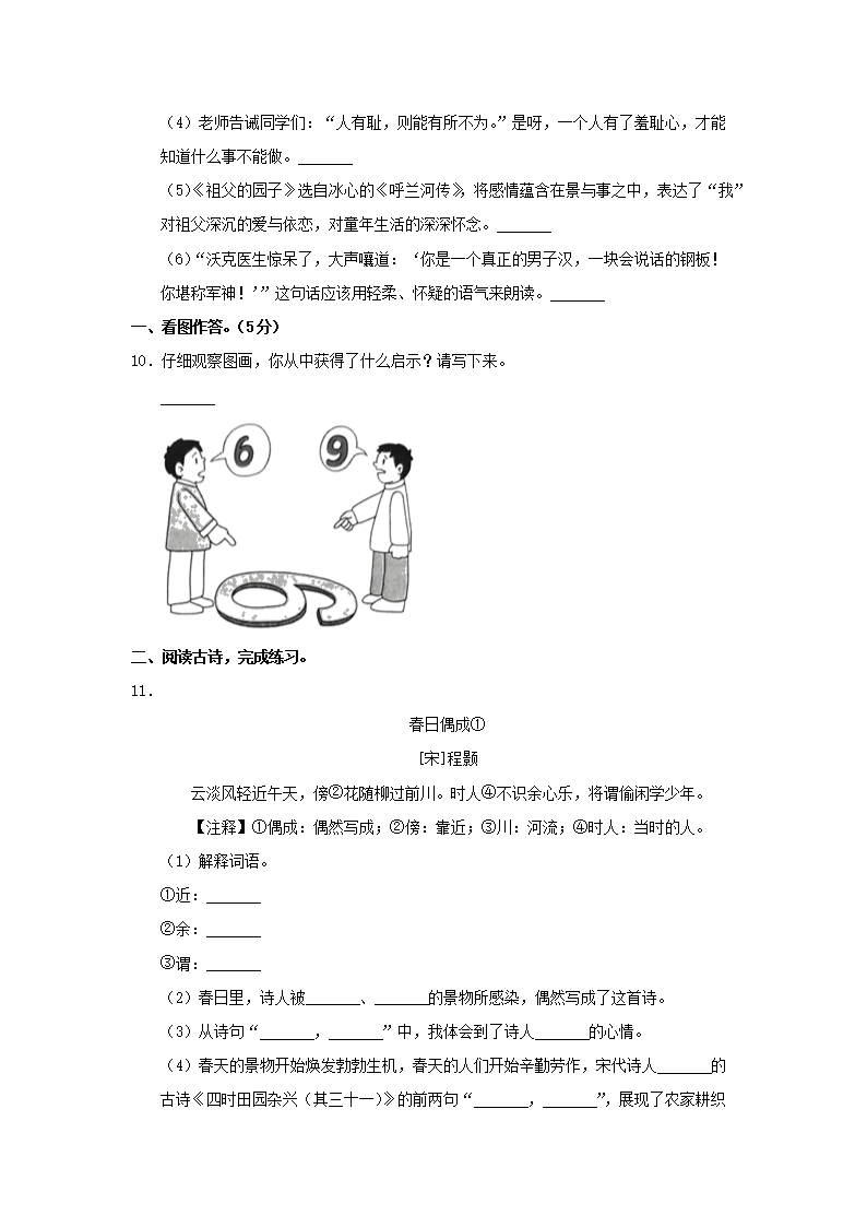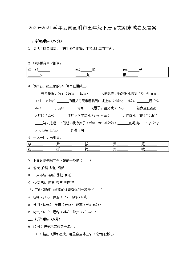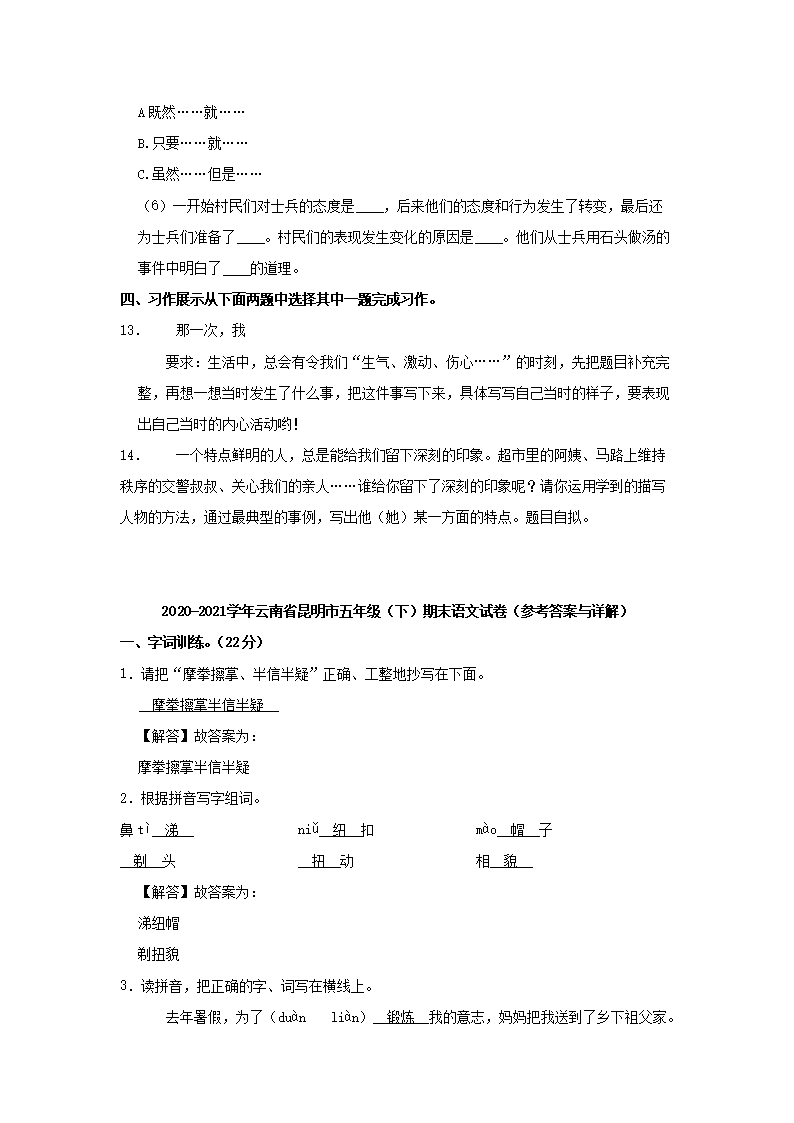 2020-2021学年云南昆明市五年级下册语文期末试卷及答案(Word版)06-29
