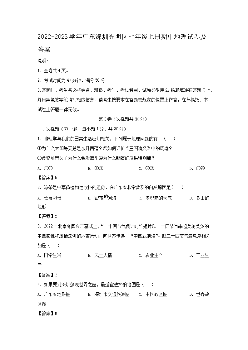 2022-2023学年广东深圳光明区七年级上册期中地理试卷及答案(Word版)09-19