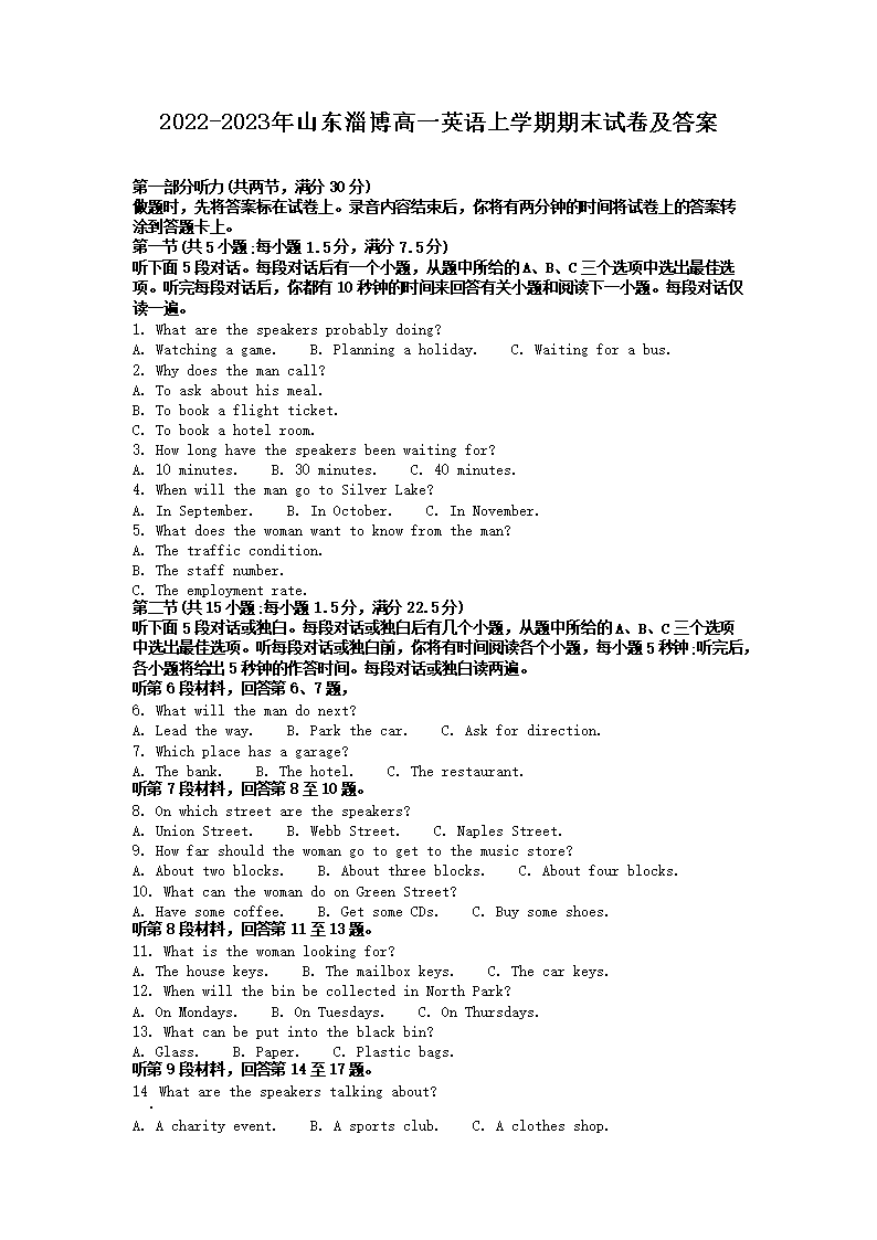 2022-2023年山东淄博高一英语上学期期末试卷及答案(Word版)09-26