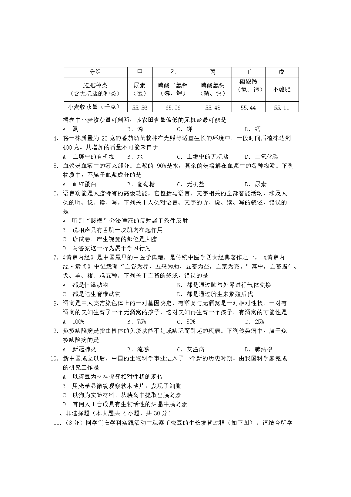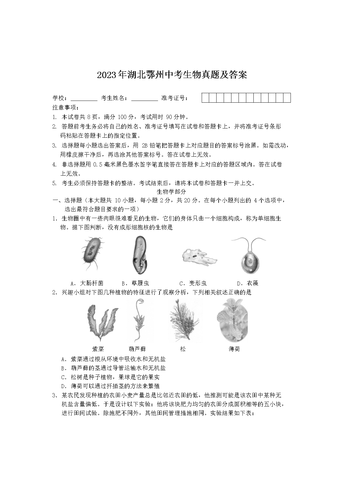 2023年湖北鄂州中考生物真题及答案(Word版)07-12