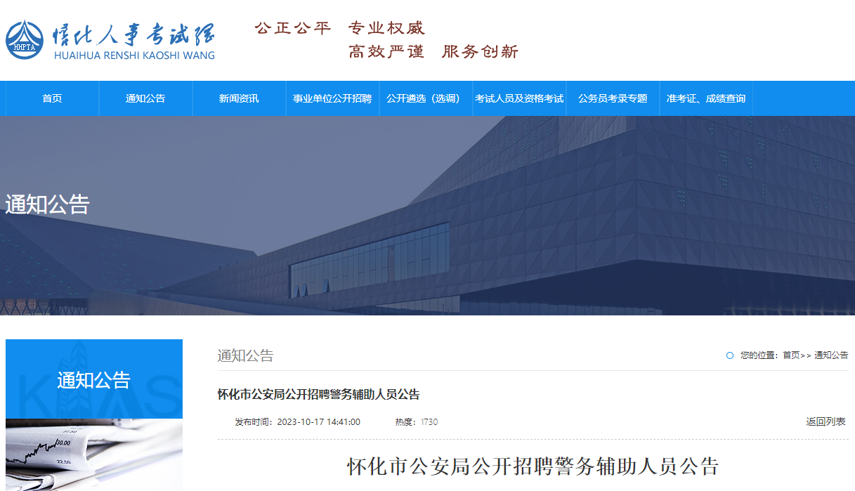 (十)公示。以上招聘程序结束后,将拟聘人员名单在对外公开的互联网网站进行公示,公示网站分别是:怀化市公安局网站和怀化人事考试网,公示期为7个工作日。公示内容包括招聘单位名称、招聘岗位情况及拟聘人员的基本情况、监督电话等。