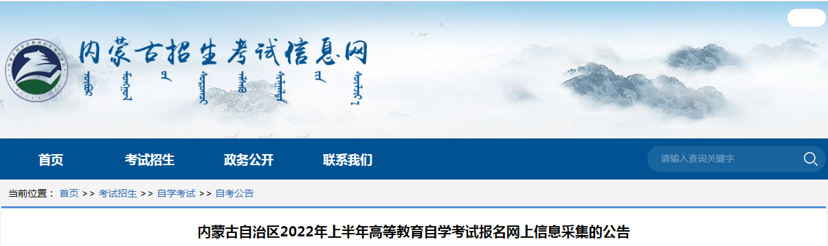 【#自考# 导语】®文档大全网自考频道从内蒙古自治区教育招生考试中心了解到,2022年上半年内蒙古自治区高等教育自学考试报名网上信息采集的公告已公布,详情如下: