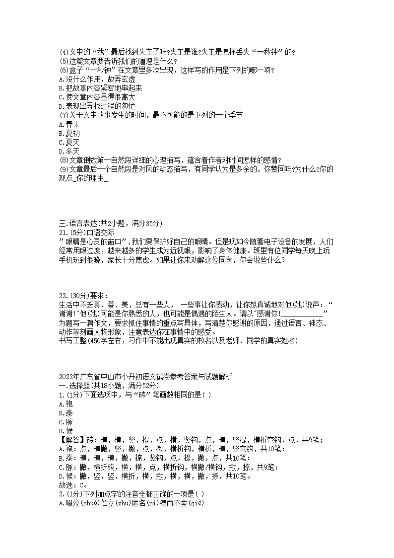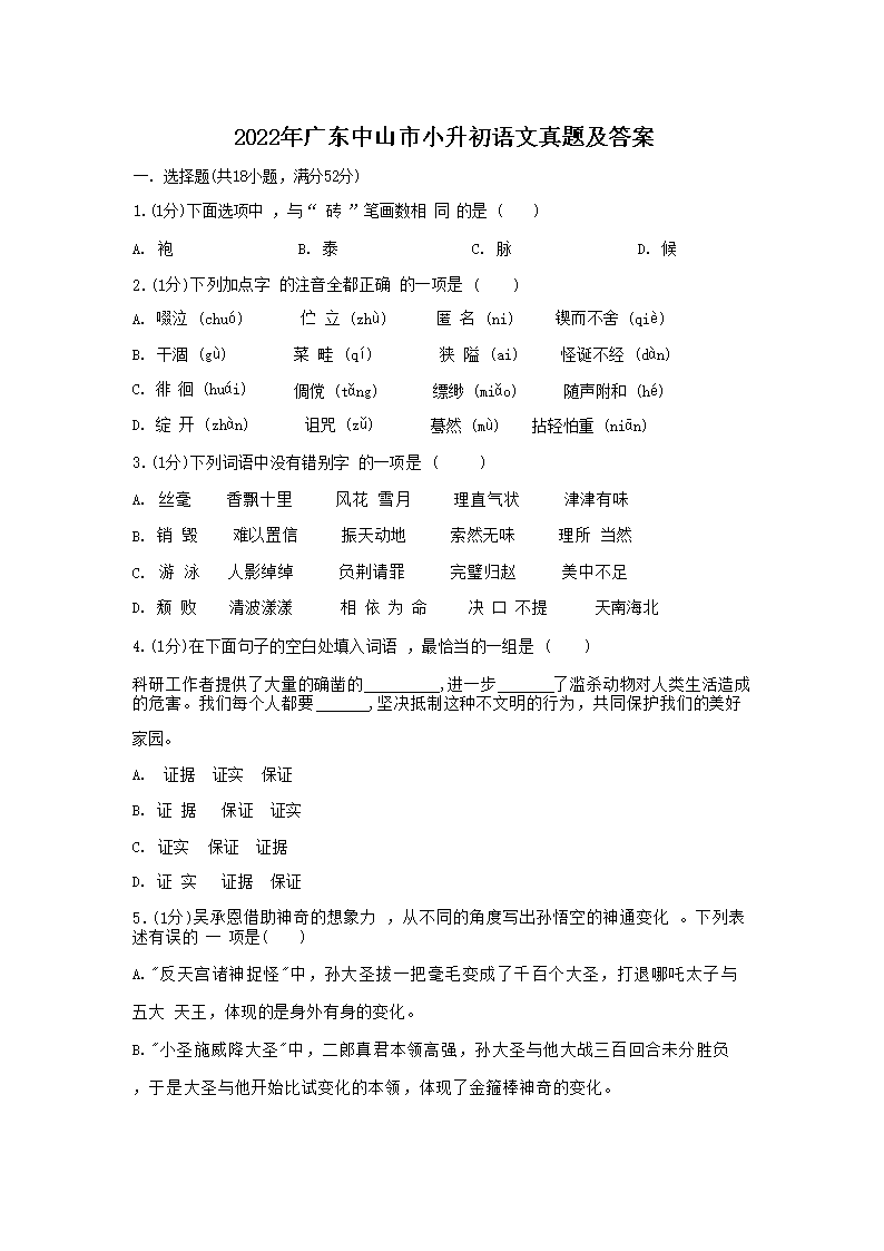 2022年广东中山市小升初语文真题及答案(Word版)05-31