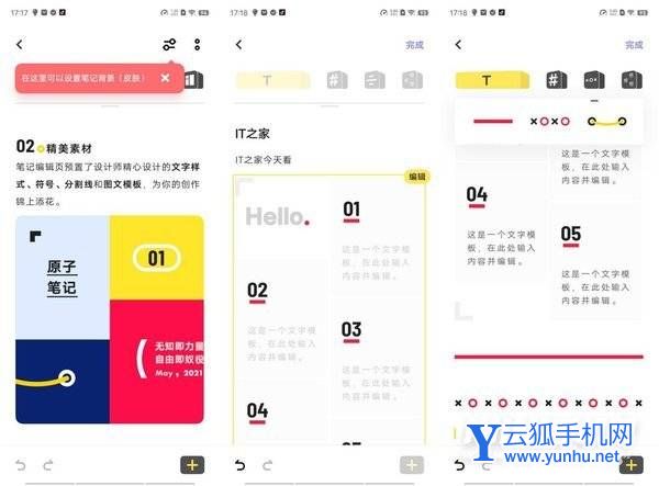 在具体的笔记编辑页面,原子笔记还自带提供了各种编辑模板、页面分割元素等,每一个都有颇高的颜值,实用的同时,你可以用它来编辑出非常漂亮的笔记。