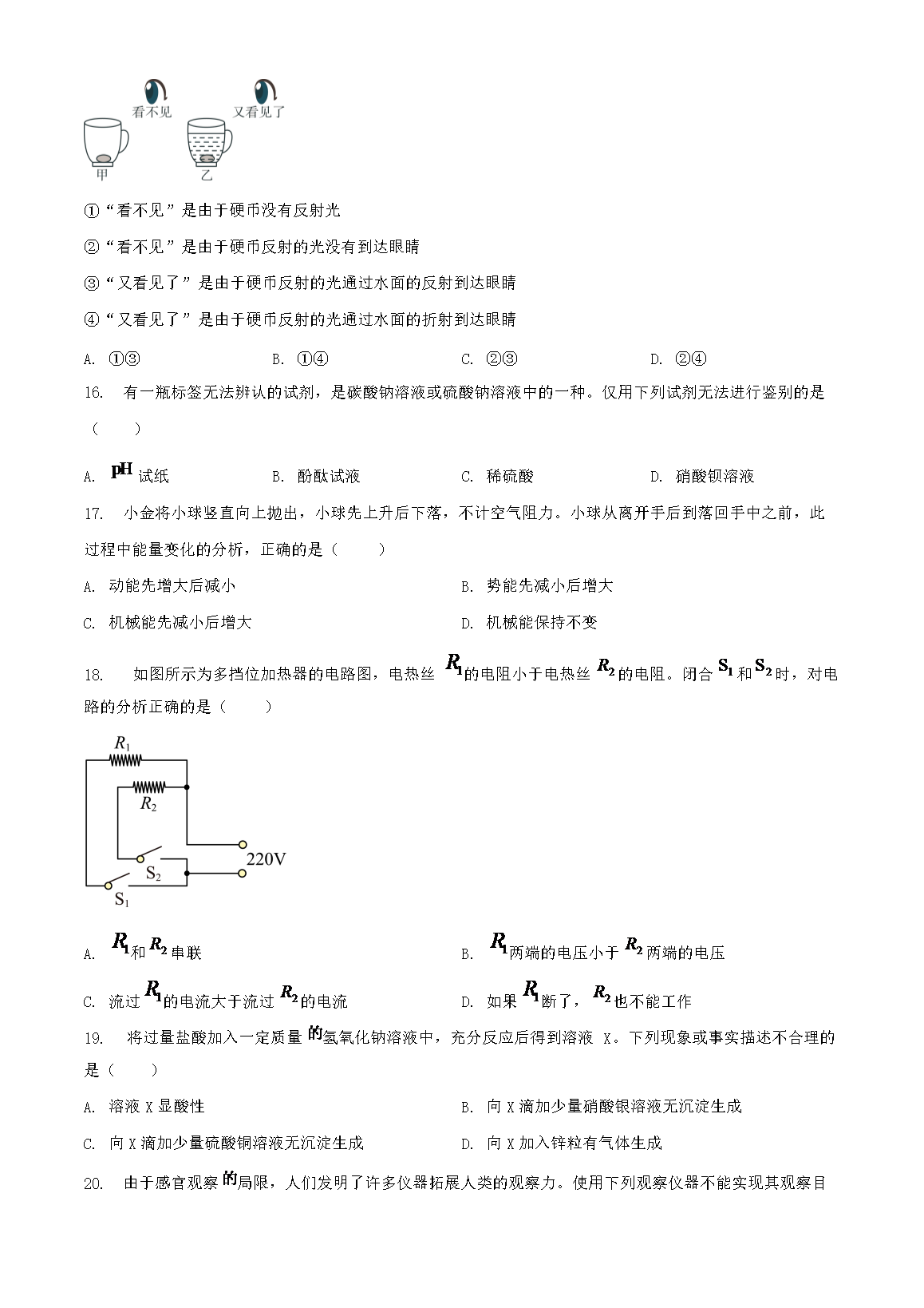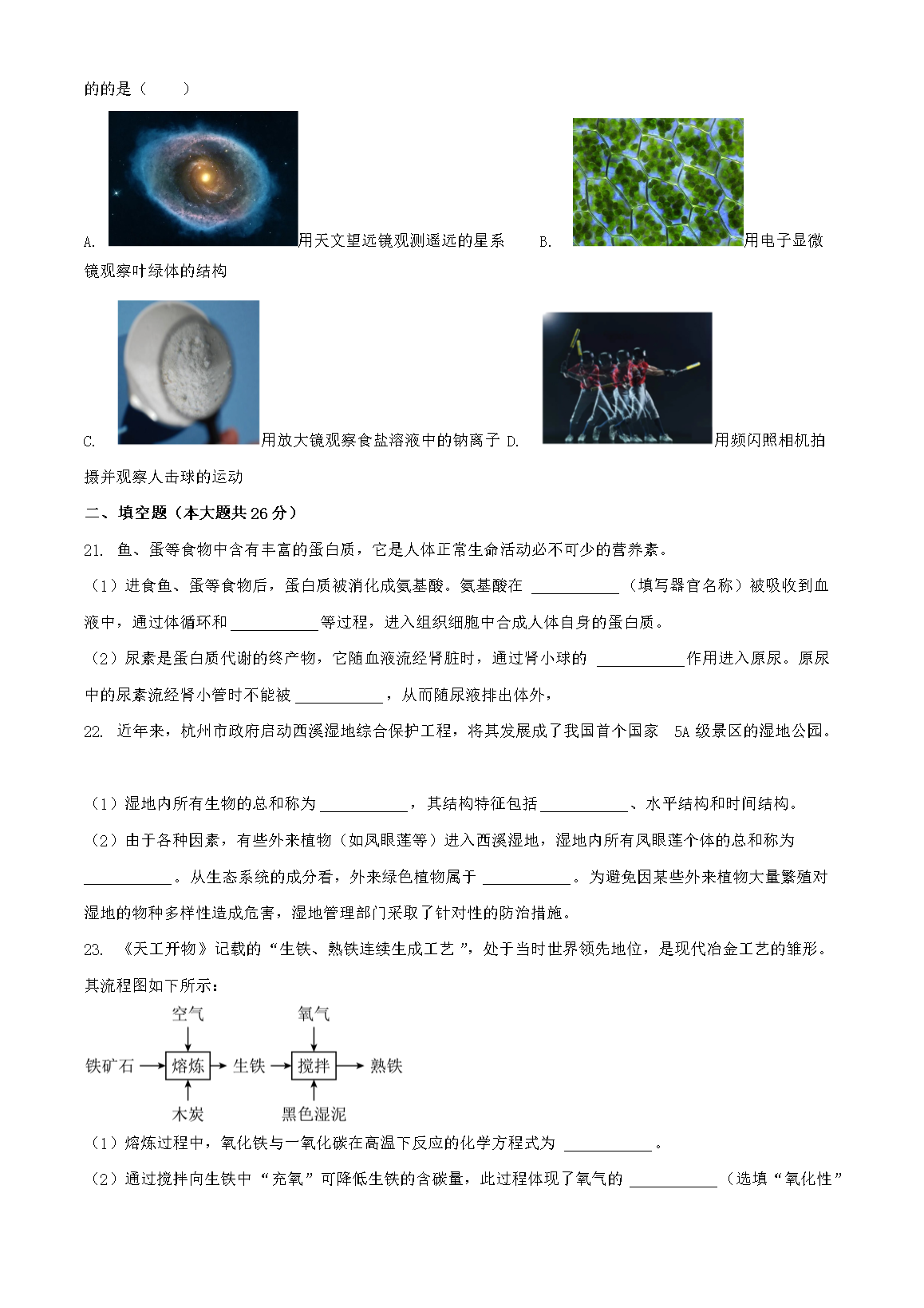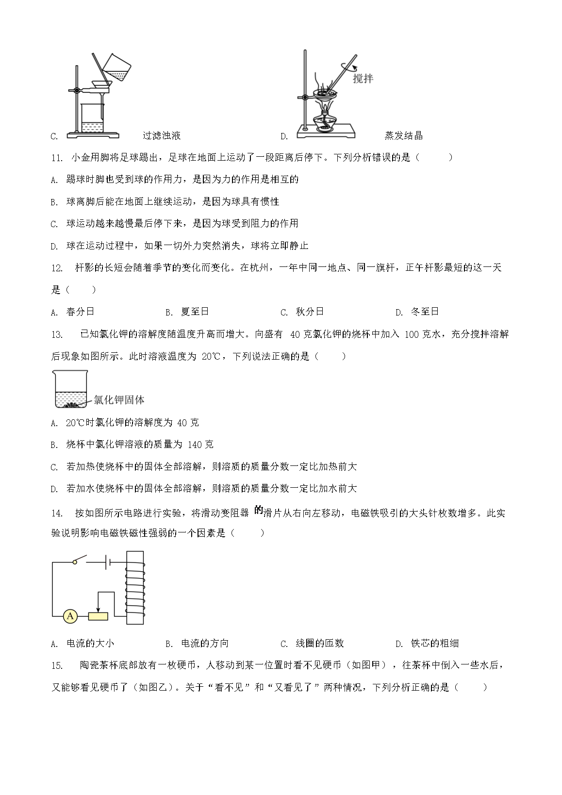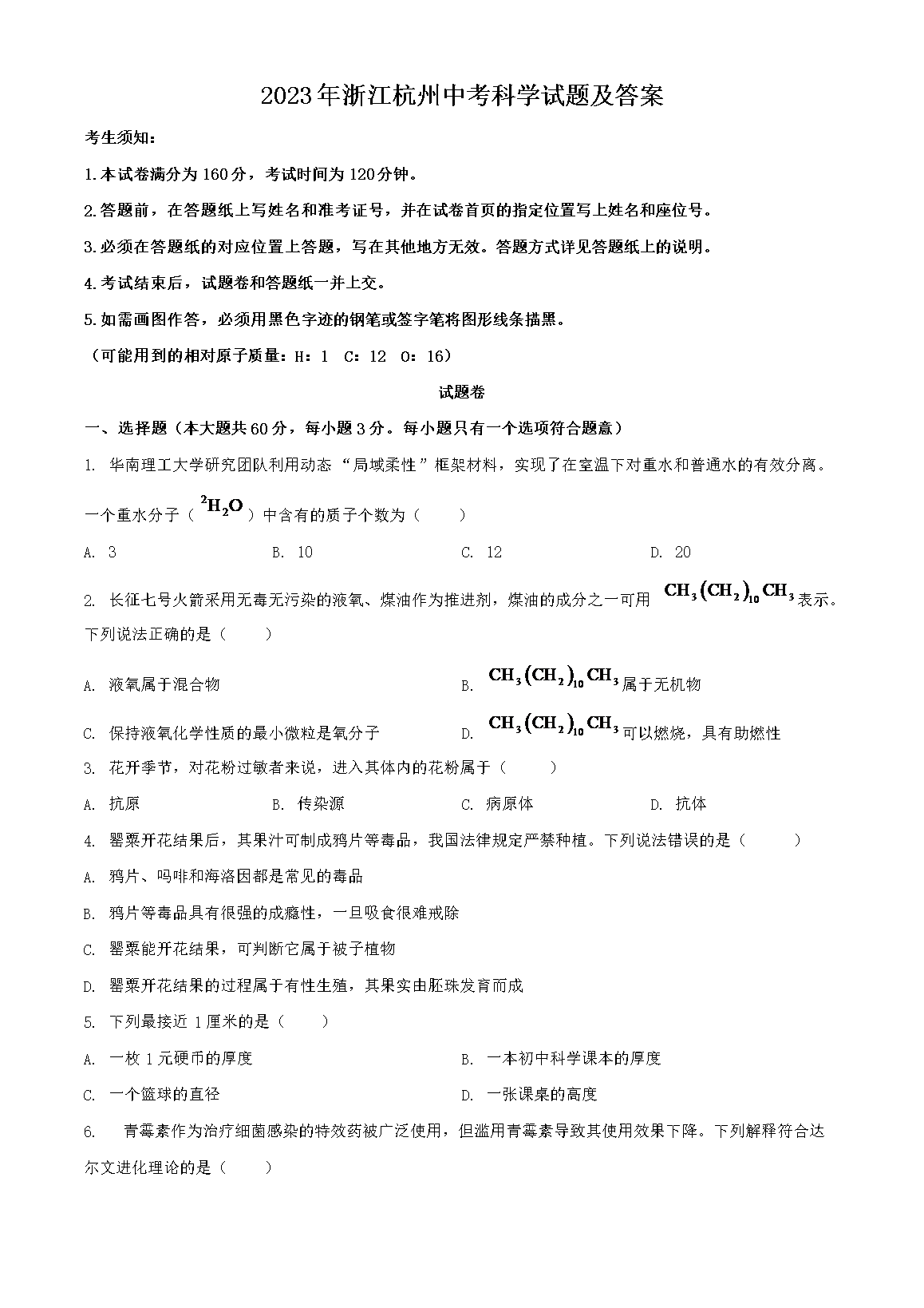 2023年浙江杭州中考科学试题及答案(Word版)07-18