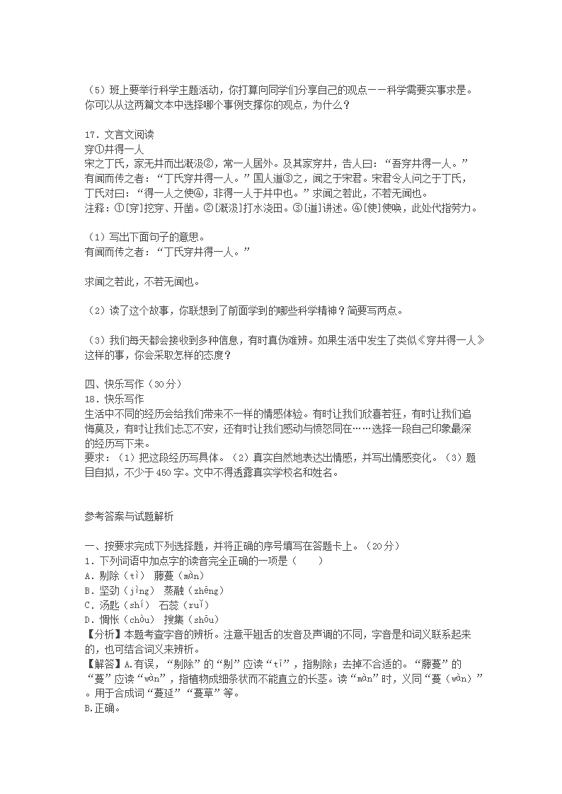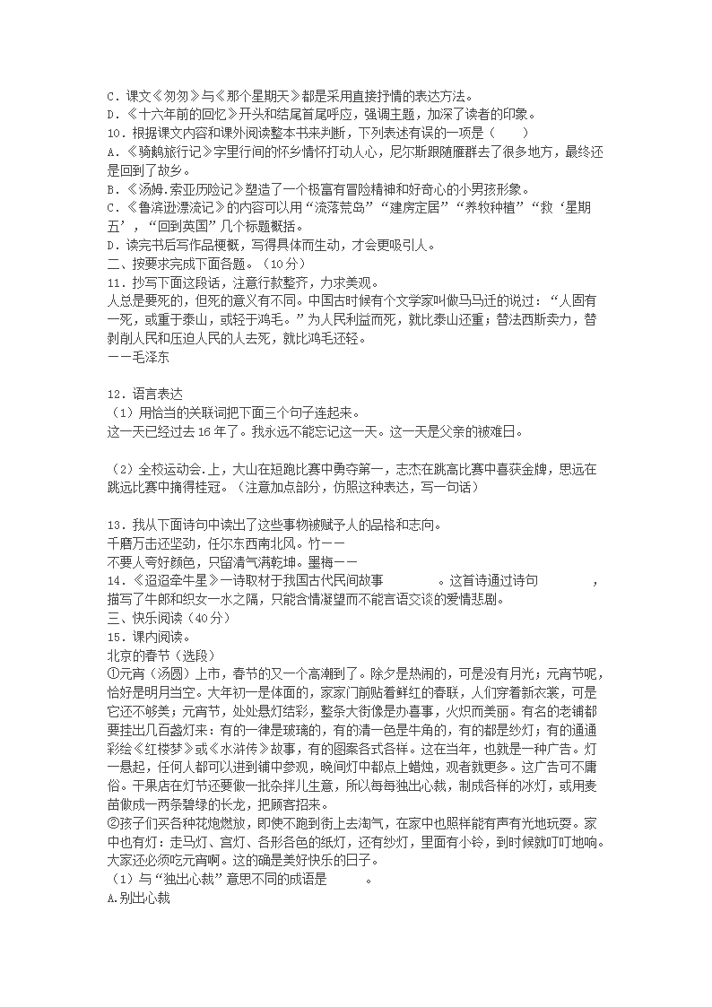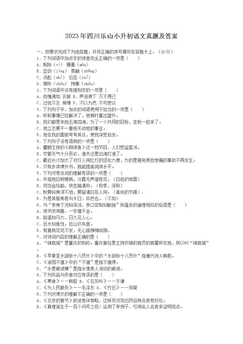 2023年四川乐山小升初语文真题及答案(Word版)09-27