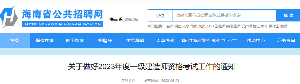 【#一级建造师# 导语】®文档大全网从海南省公共招聘网获悉,《2023年海南一级建造师资格考试考务工作通知》现已发布,2023年海南一级建造师报名时间:6月30日-7月10日,考试时间:11月19日-20日,现将报考信息发布如下: