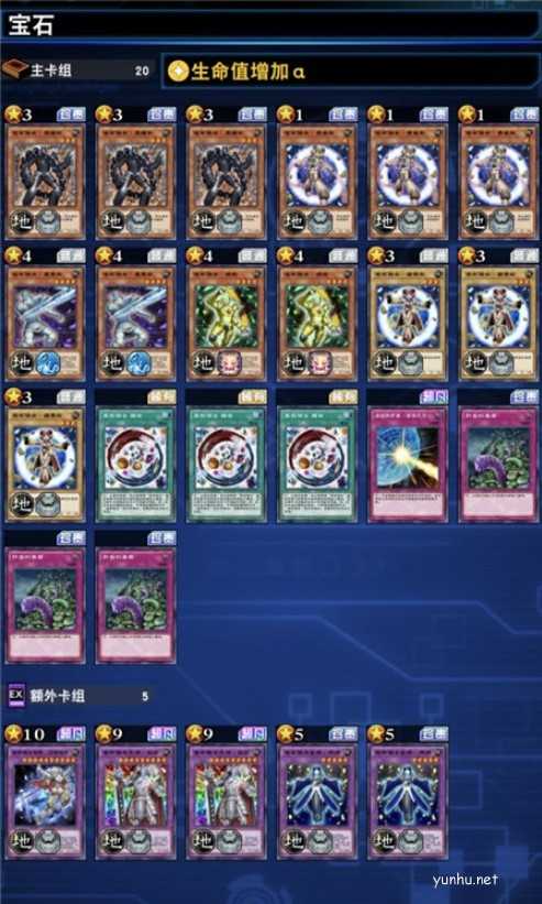 新卡包出来前最让我期待的就是宝石骑士了,最后果然也不负众望,能够组出有一定强度的卡组。个人认为下面这套卡组强度应当在科学怪人卡组之上,至少算是娱乐卡组中的豪杰,甚至可能有t3到t2的强度。更关键的是这套卡组操作感拉满,顺利展开时一回合打空额外卡组,并纯靠效果伤害一回合杀满血对手。