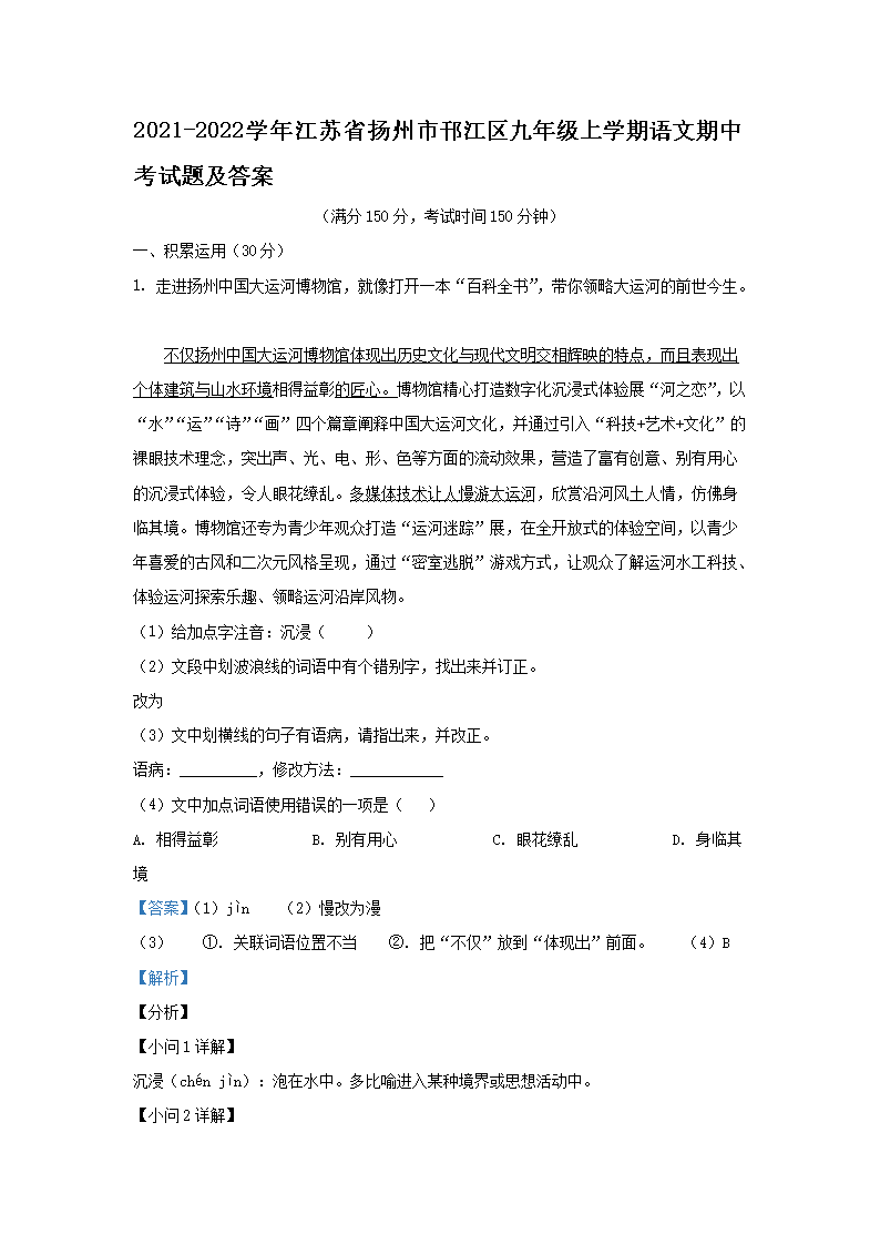 2021-2022学年江苏省扬州市邗江区九年级上学期语文期中考试题及答案(Word版)09-13