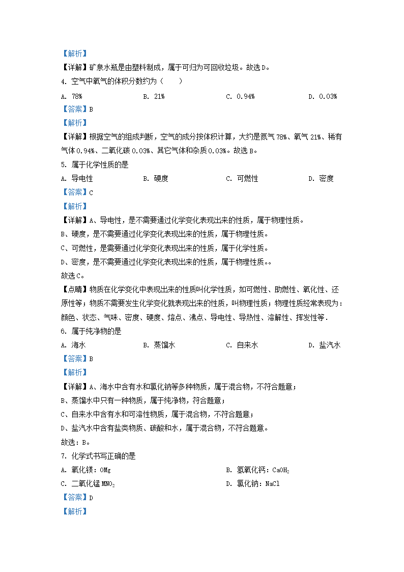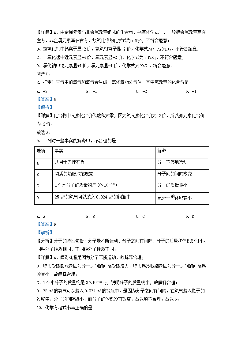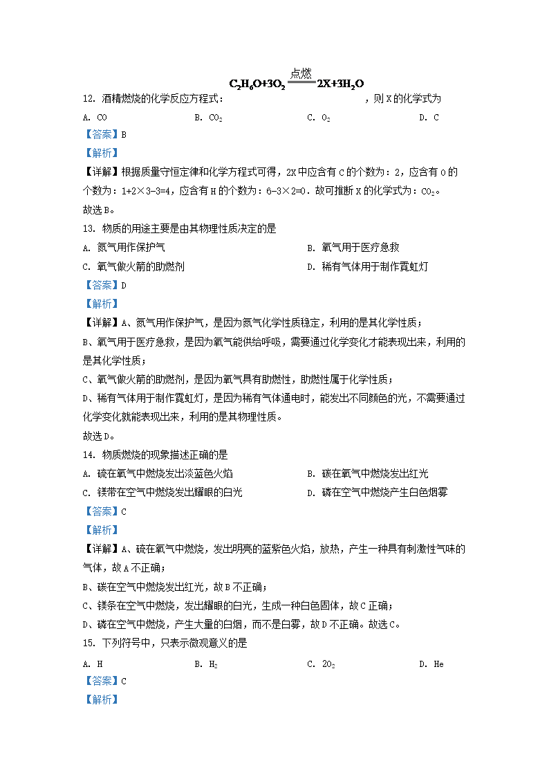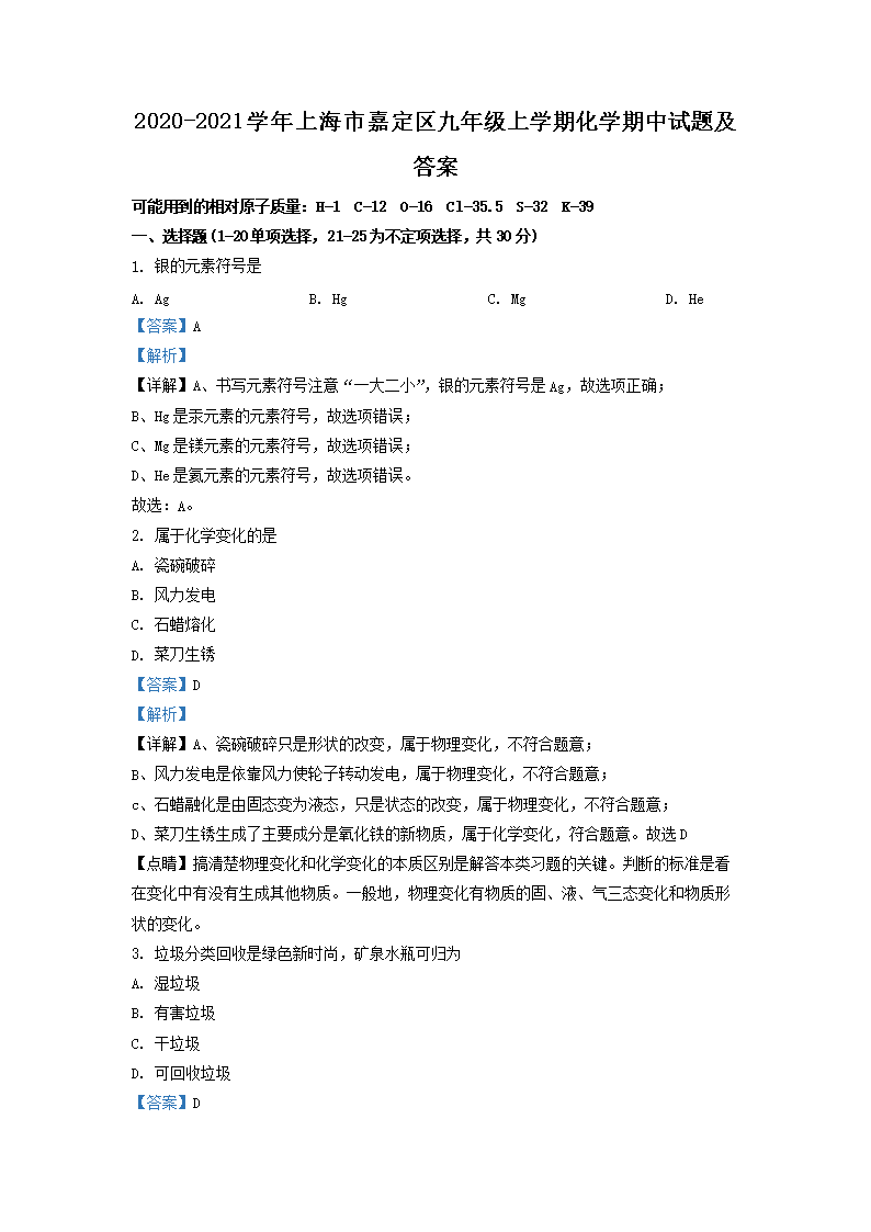 2020-2021学年上海市嘉定区九年级上学期化学期中试题及答案(Word版)10-20