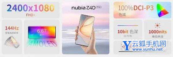 努比亚 Z40 Pro 拥有星际黑、星河银两款配色,机身重量为 199g,厚度为 8.46mm,配备了一块 6.67 英寸的 AMOLED 柔性曲面屏,支持 60Hz 到 144Hz 智能刷新,1000 尼特峰值亮度。