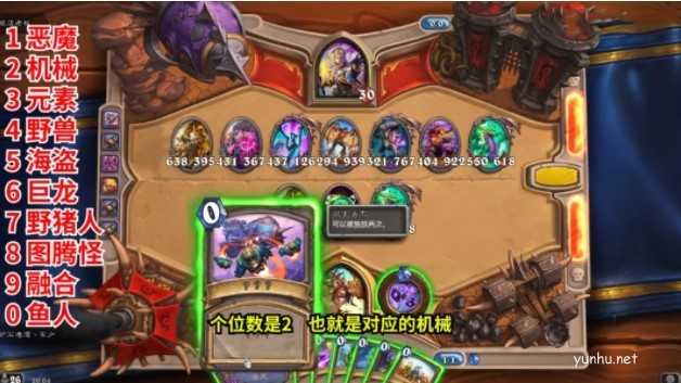 知道计算范围了以后,就是计算三个数值。首先是种族,计算方式是从计算范围最左边的随从到最右边的随从的种族之和,然后取个位数。我这题种族数值是2+7+6+5+7+9+6=42,个位数是2,也就是对应的机械,所以就把机械牌贴给“?”