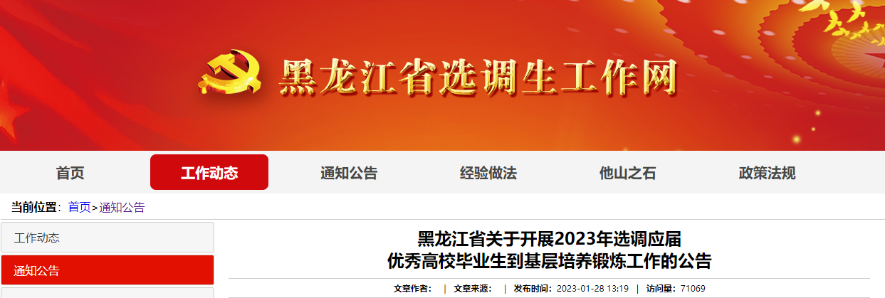 原文标题:黑龙江省关于开展2023年选调应届优秀高校毕业生到基层培养锻炼工作的公告