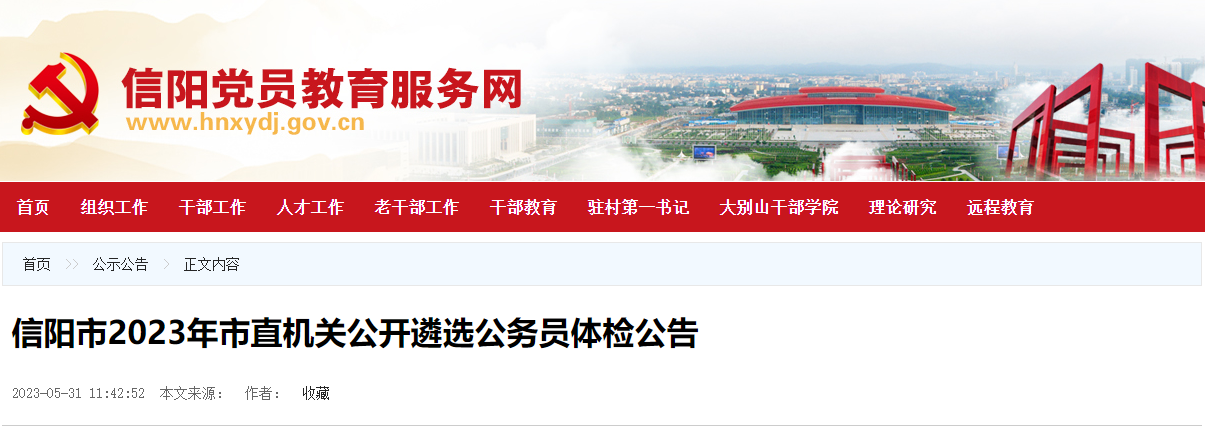 【#遴选# 导语】®文档大全网从信阳党员教育服务网了解到,2023年河南信阳市市直机关遴选公务员体检时间:6月4日,相关事宜如下: