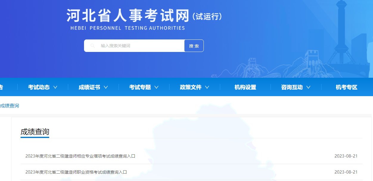 2023年河北二级建造师考试成绩查询时间:8月21日起,报考人员通过“河北省人事考试网(www.hebpta.com.cn)”查询考试成绩!