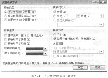 ①打开演示文稿,单击“幻灯片放映”选项卡“设置”组的“设置幻灯片放映”按钮,出现“设置放映方式”对话框,如图5—41所示。