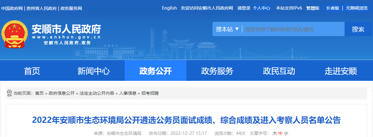 原文标题:2022年安顺市生态环境局公开遴选公务员面试成绩、综合成绩及进入考察人员名单公告