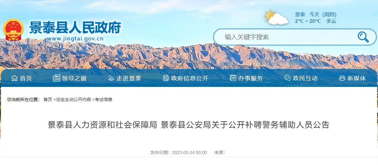【#招警考试# 导语】®文档大全网从景泰县人民政府了解到,2023年甘肃白银景泰县公安局补聘警务辅助人员20人,相关事宜如下: