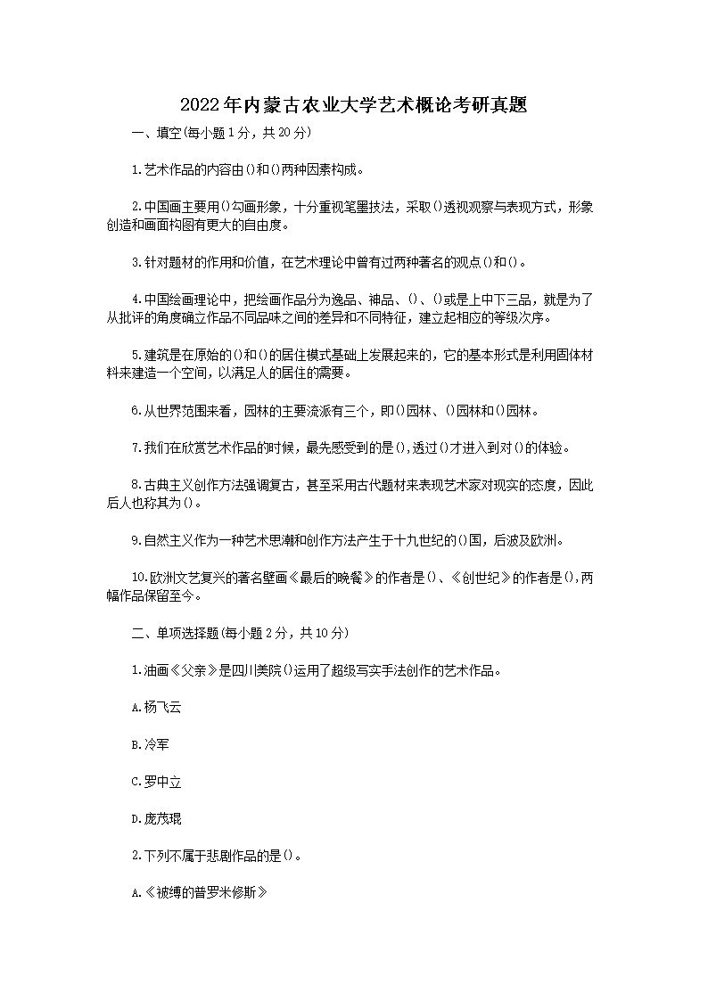 2022年内蒙古农业大学艺术概论考研真题(Word版)07-06