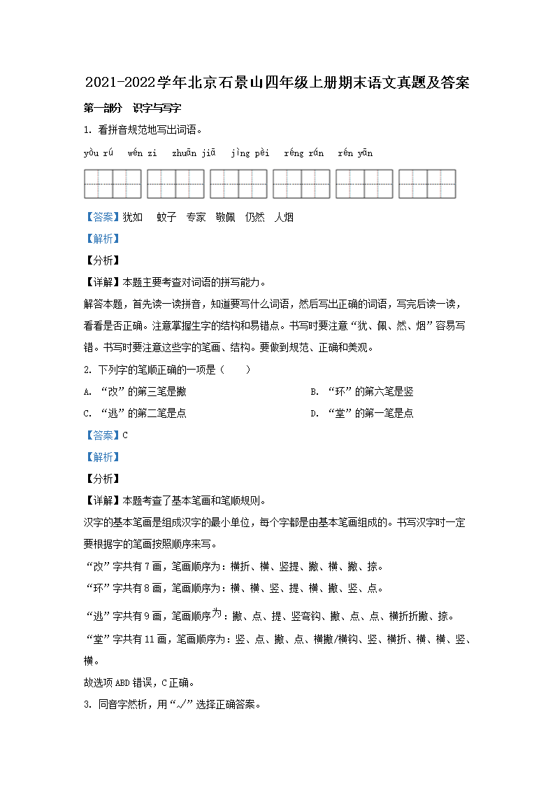 【文档预览】 文档大全网整理发布2021-2022学年北京石景山四年级上册期末语文真题及答案(Word版),前五页预览如下: