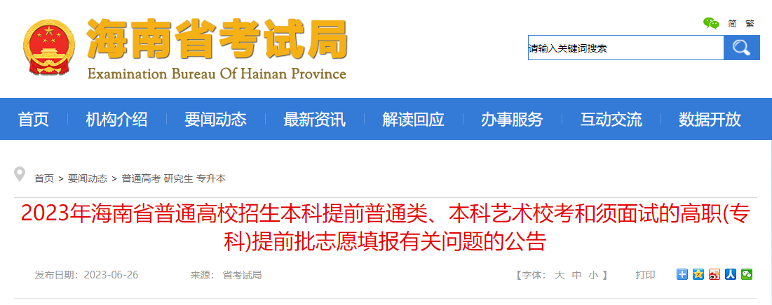 我省2023年普通高校招生本科提前普通类、本科艺术校考和须面试的高职(专科)提前批志愿的填报工作于6月27日进行,现将填报志愿的有关要求公告如下: