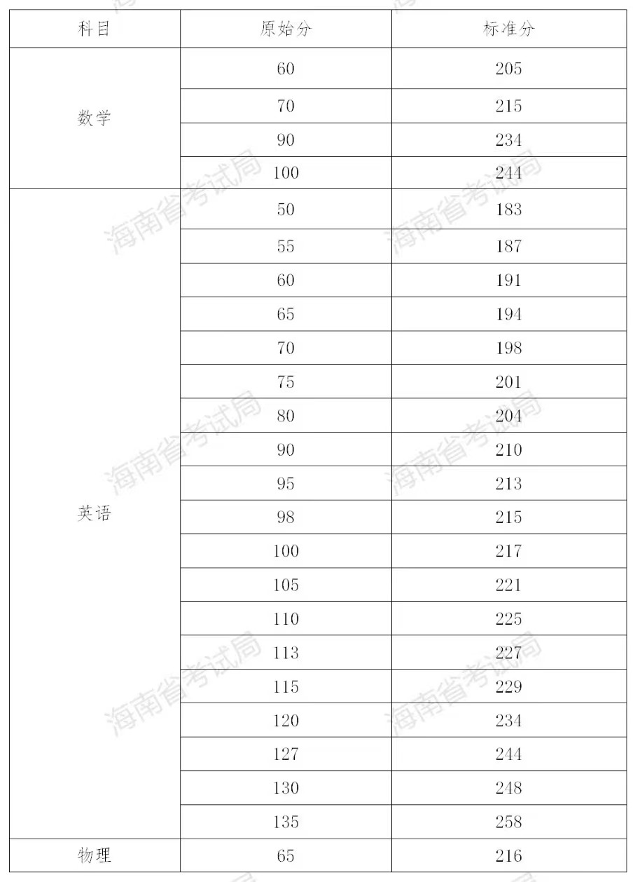 4.香港中文大学、香港城市大学等有关院校或专业录取时对高考语文、数学、英语原始分成绩有要求。为方便考生填报志愿,现将《2023年海南省普通高考数学、英语、物理部分成绩原始分和标准分对照表》公布如下: