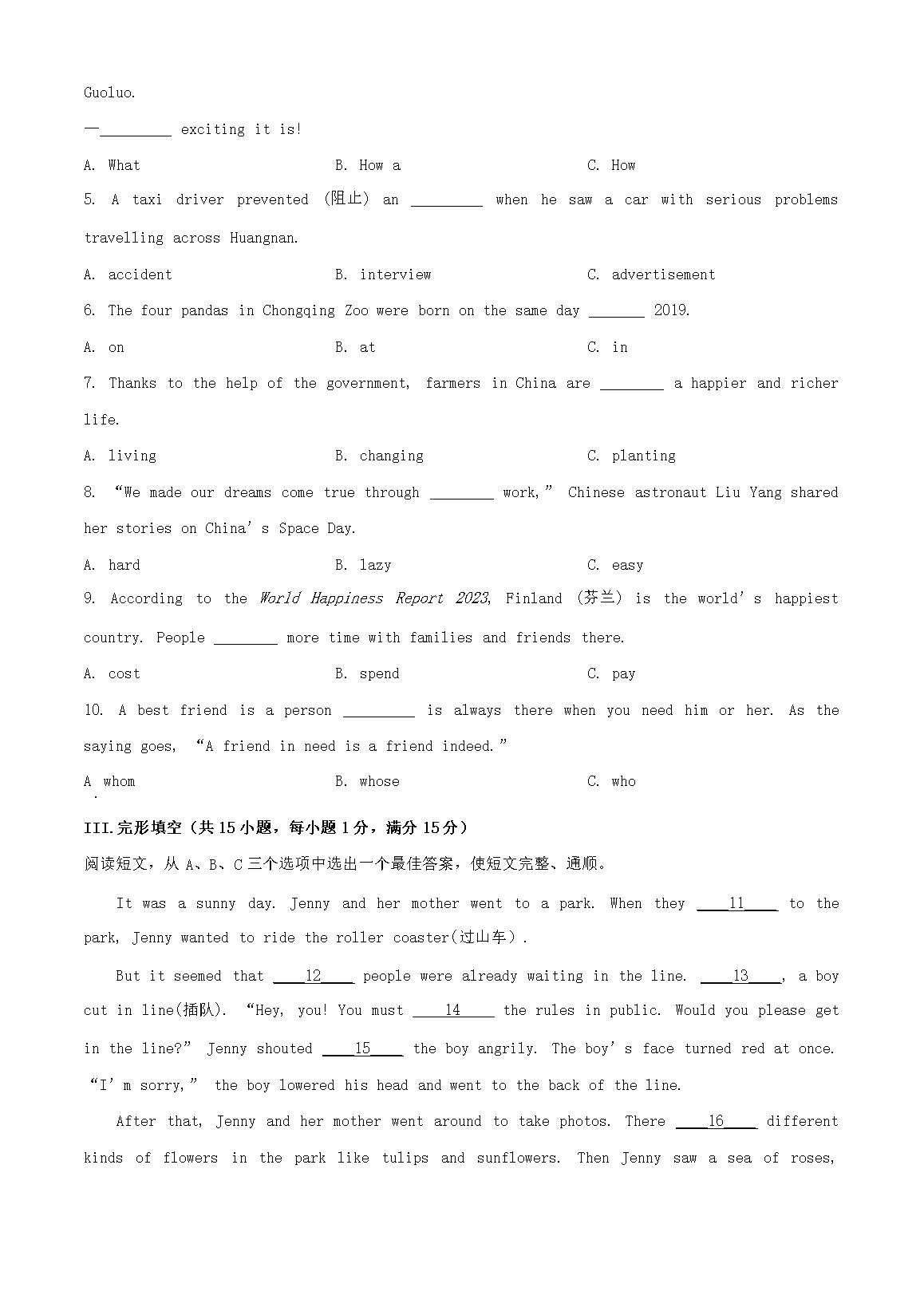 2023年青海海北中考英语真题及答案(Word版)08-10