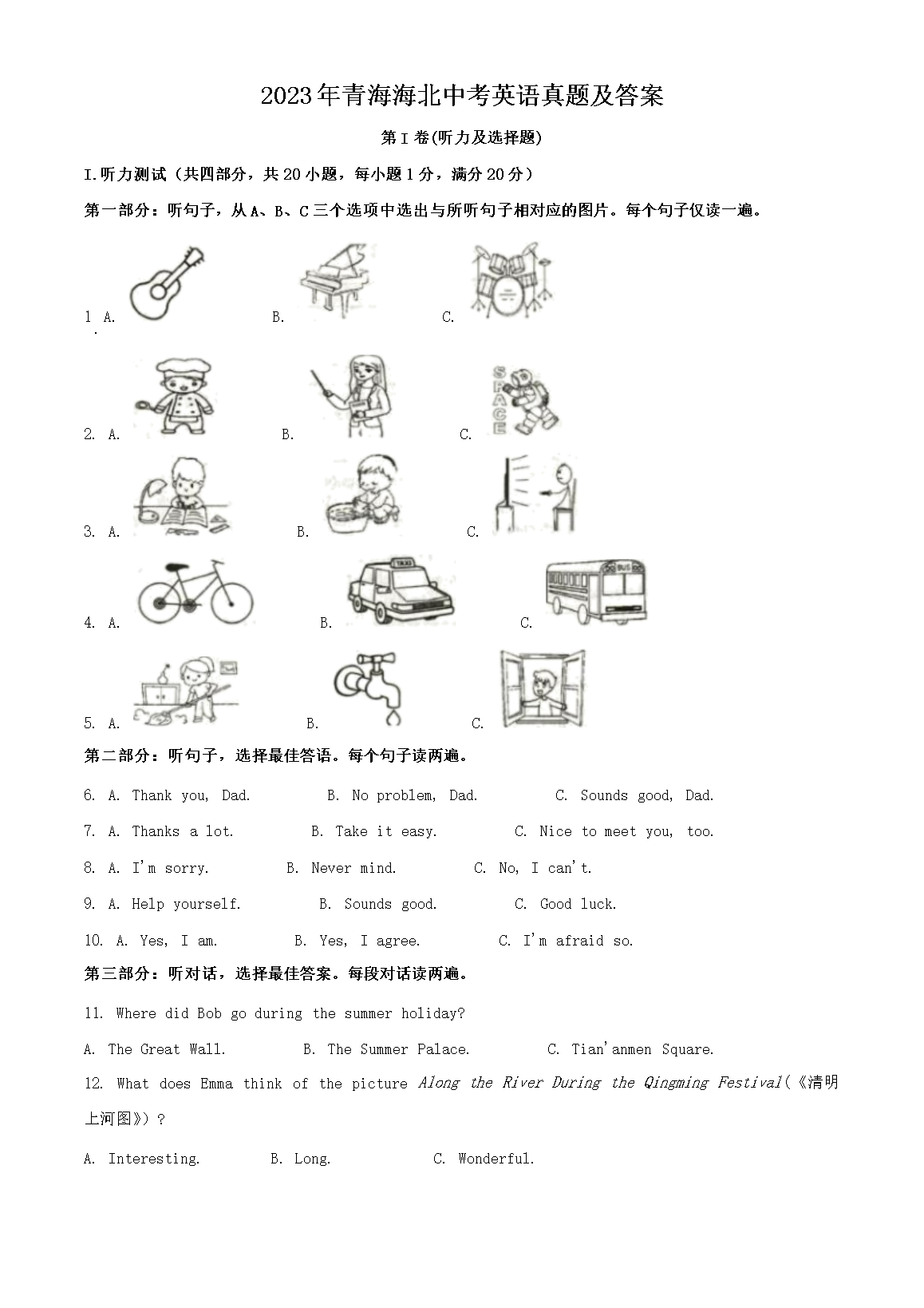 【文档预览】 文档大全网整理发布2023年青海海北中考英语真题及答案(Word版),前五页预览如下:
