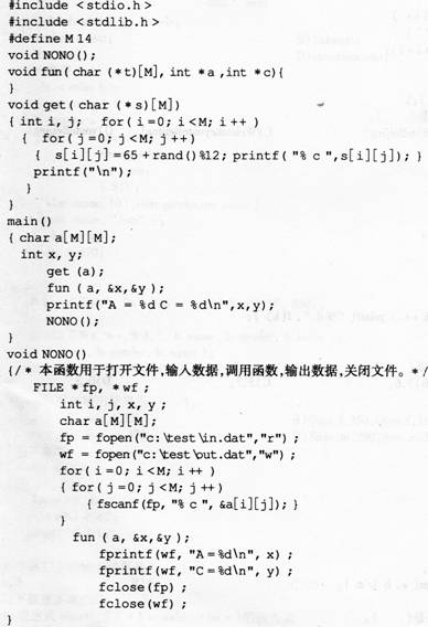 43、请编写函数fun,其功能是分别统计形参t所指二维数组中字母A和c的个数。