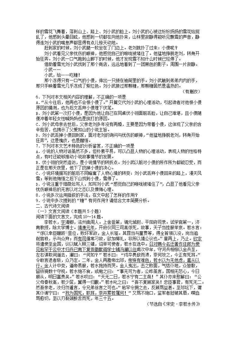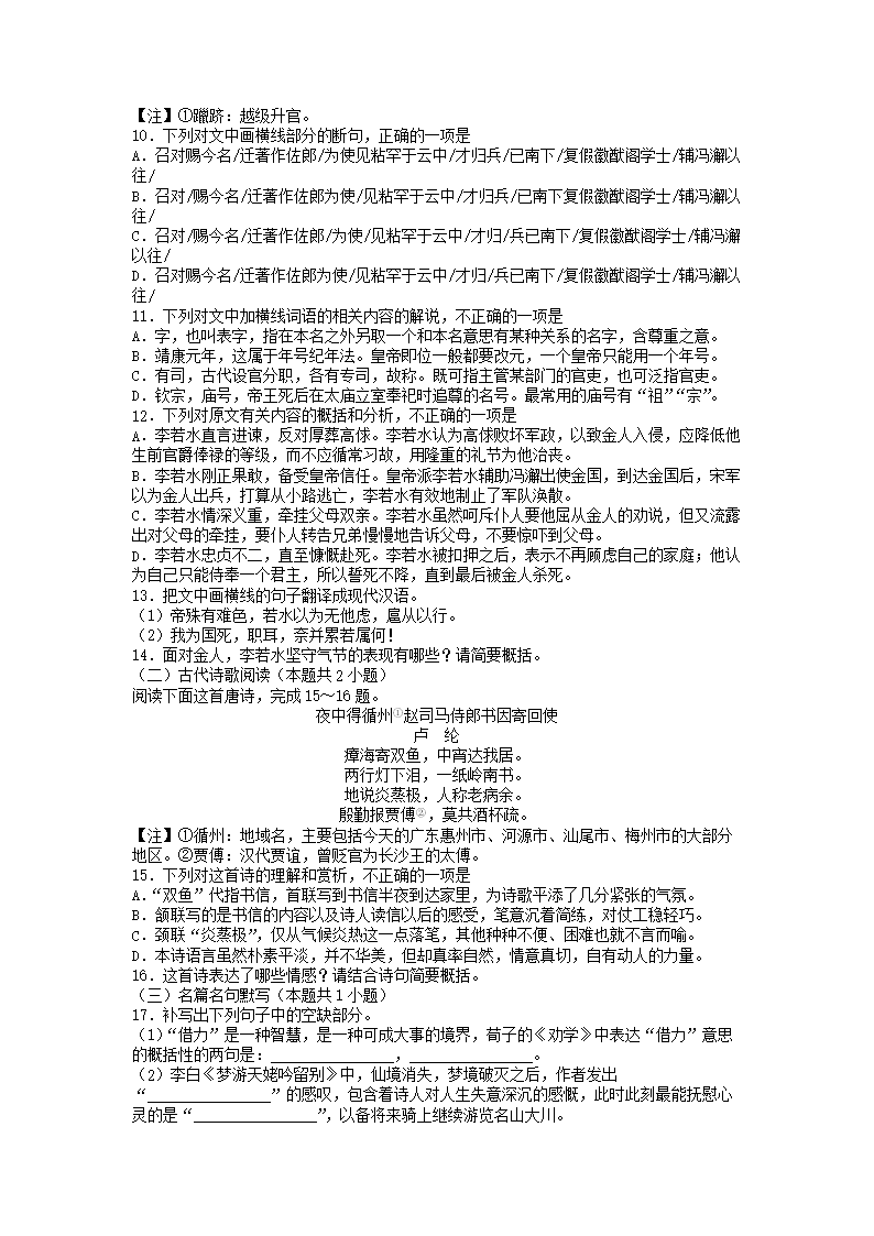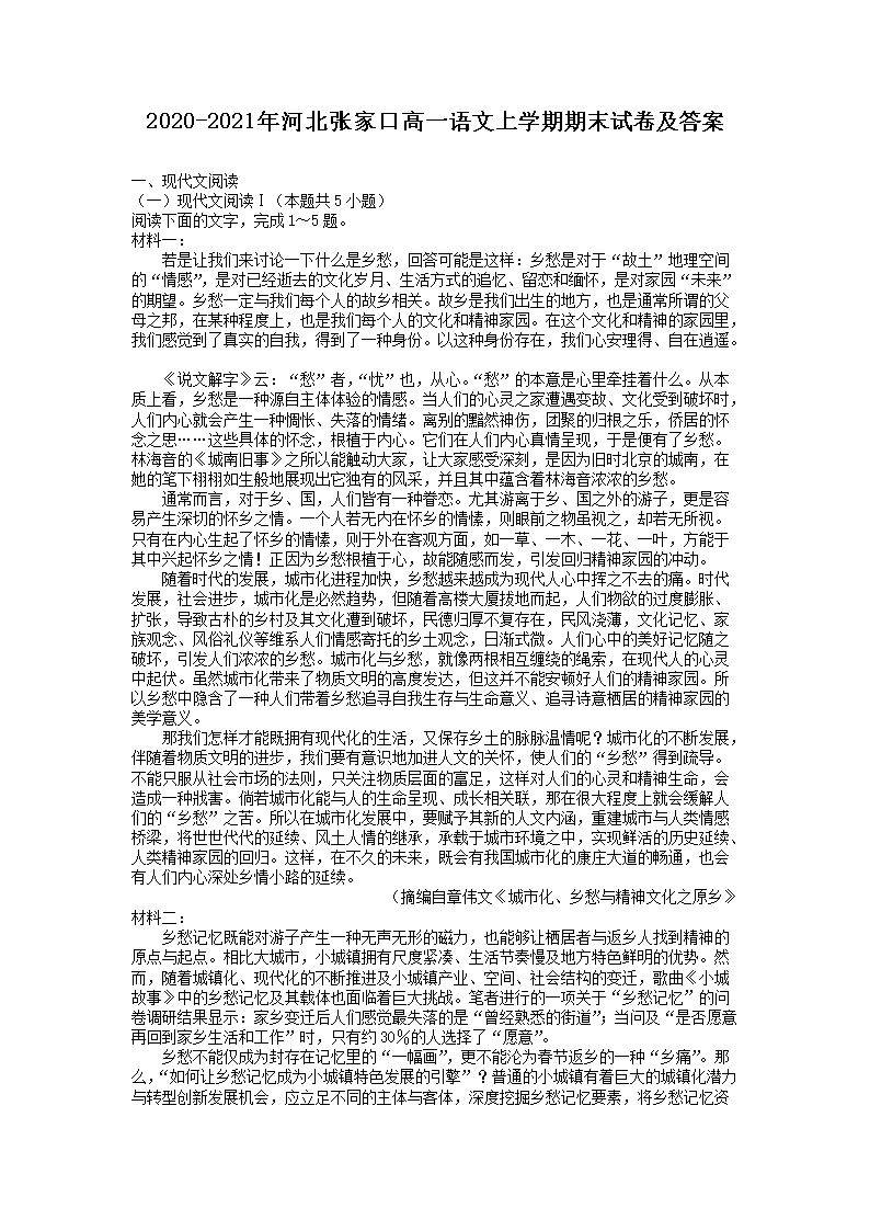 2020-2021年河北张家口高一语文上学期期末试卷及答案(Word版)09-15