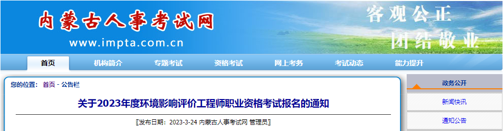 2023年内蒙古环境影响评价工程师报名时间:2023年3月29日9:00—4月6日24:00,报名工作采用网上报名的方式,报名网站“中国人事考试网(www.cpta.com.cn)”。