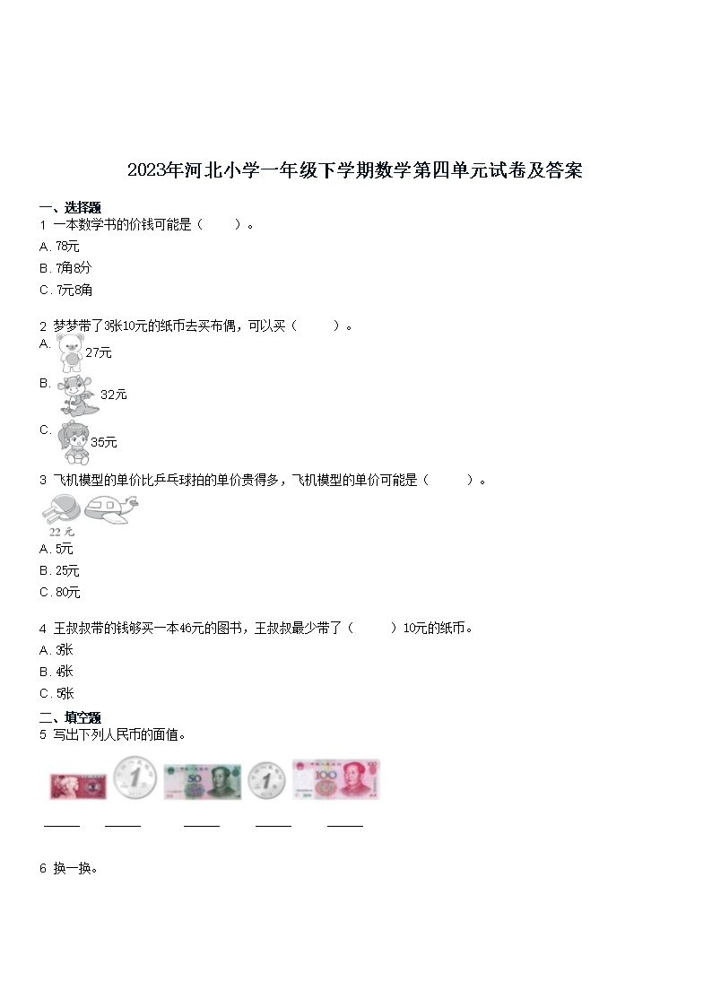 【文档预览】 文档大全网整理发布2023年河北小学一年级下学期数学第四单元试卷及答案(Word版),前五页预览如下: